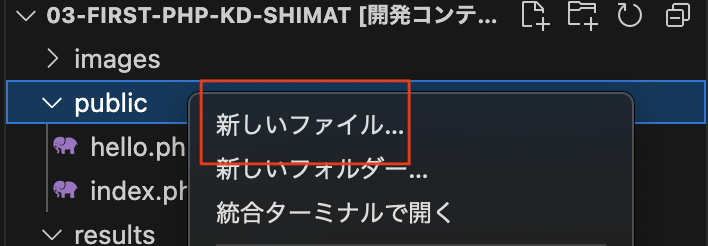 publicを選択し、右クリックで「新しいファイル…」を選択する