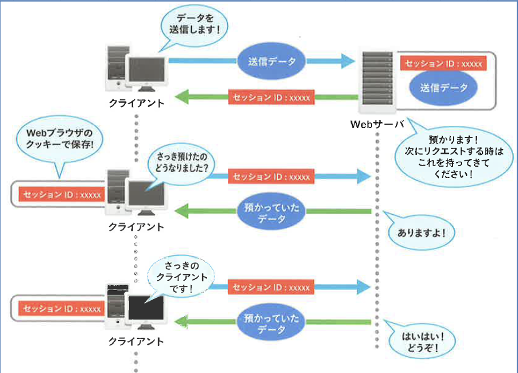 - 以後の通信では、クッキーに含まれたセッションIDを使って、サーバーがユーザーを識別