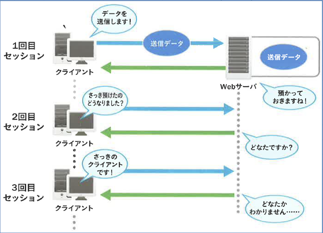 以前、HTTPはステートレスなプロトコルであると説明しました。 つまり、「前回の通信内容」を覚えておく仕組みが基本的にありません。