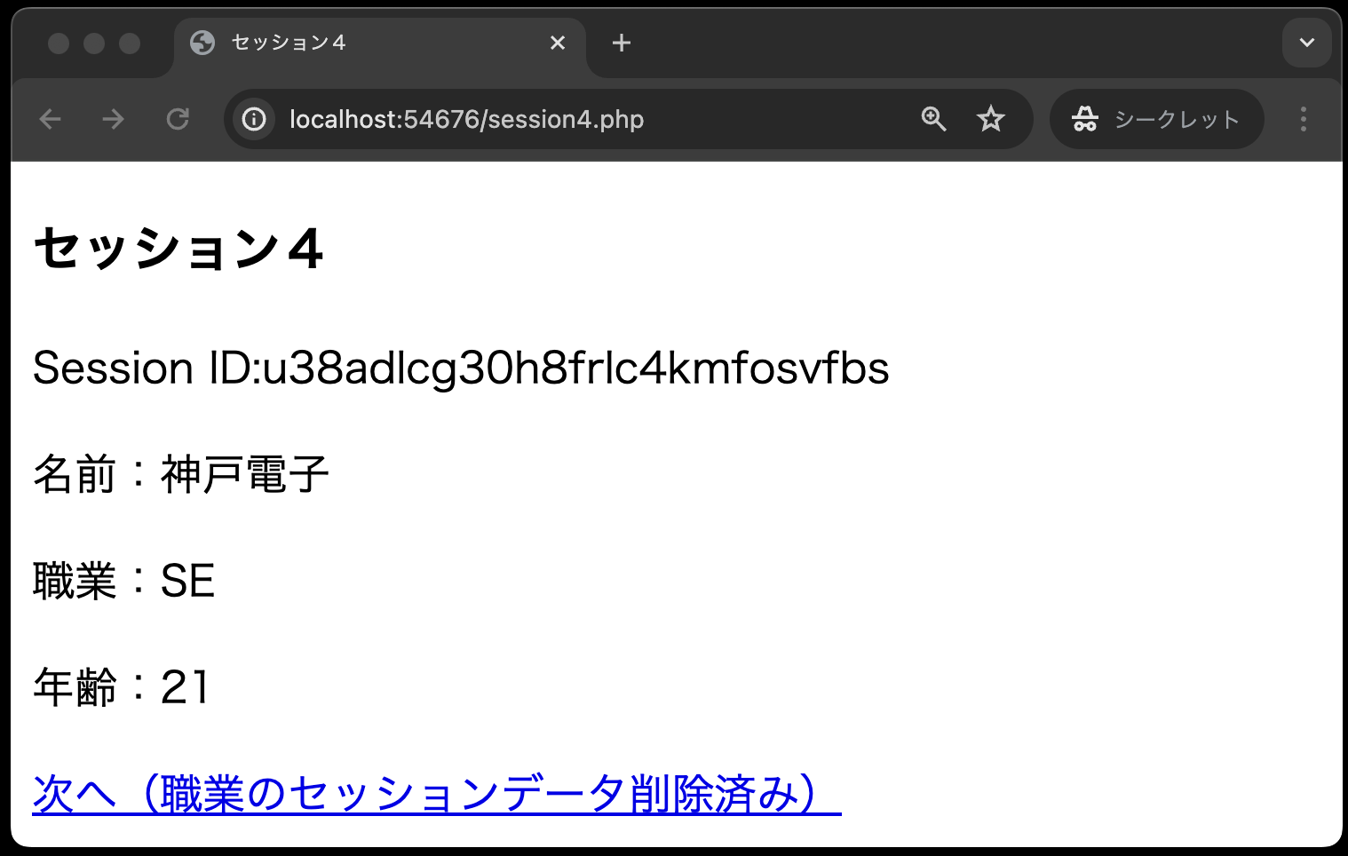 職業のデータはセッションから削除されているため、エラーメッセージが表示されます。 セッションID、名前、年齢の情報を画面に表示した後、すべてのデータをセッションから削除します。