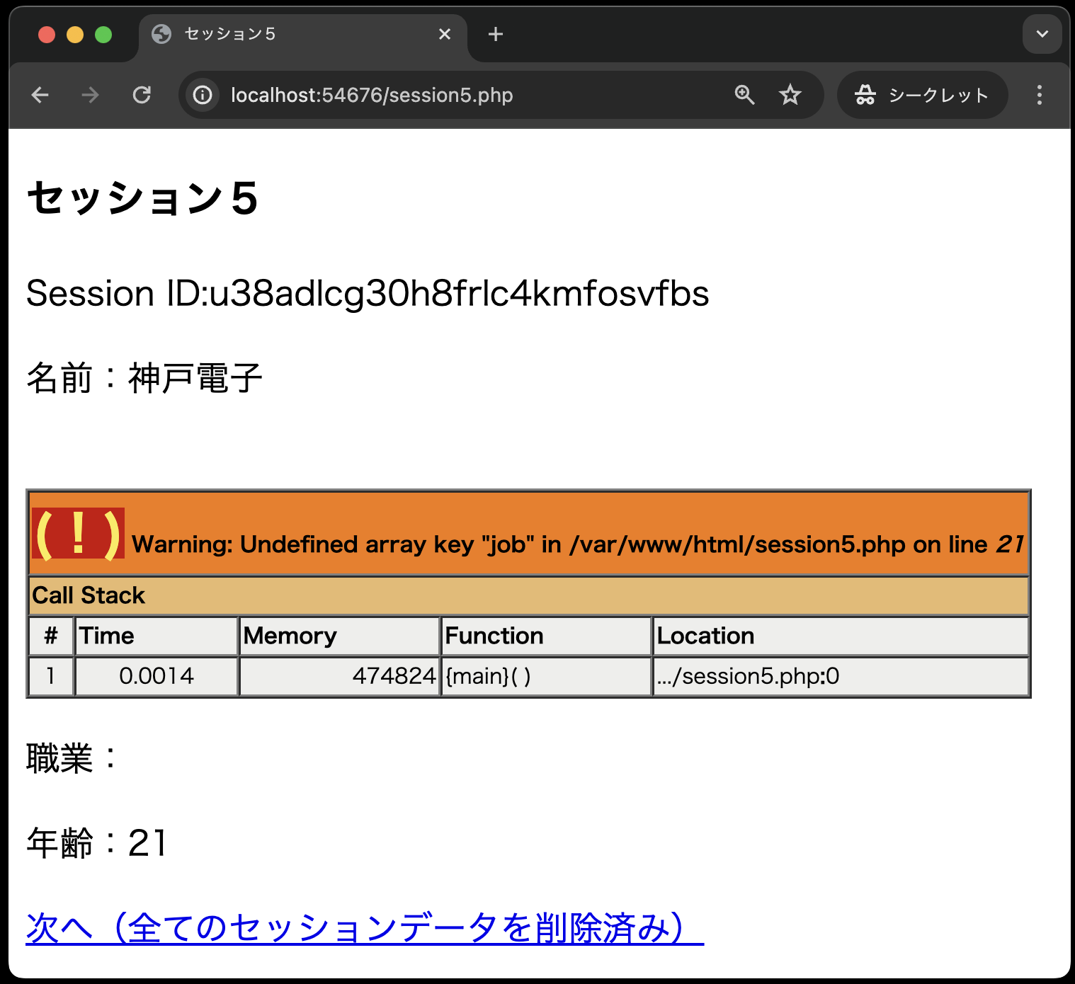 前のsession4.phpで「job」のセッション変数は削除されているためエラーメッセージが表示されます。