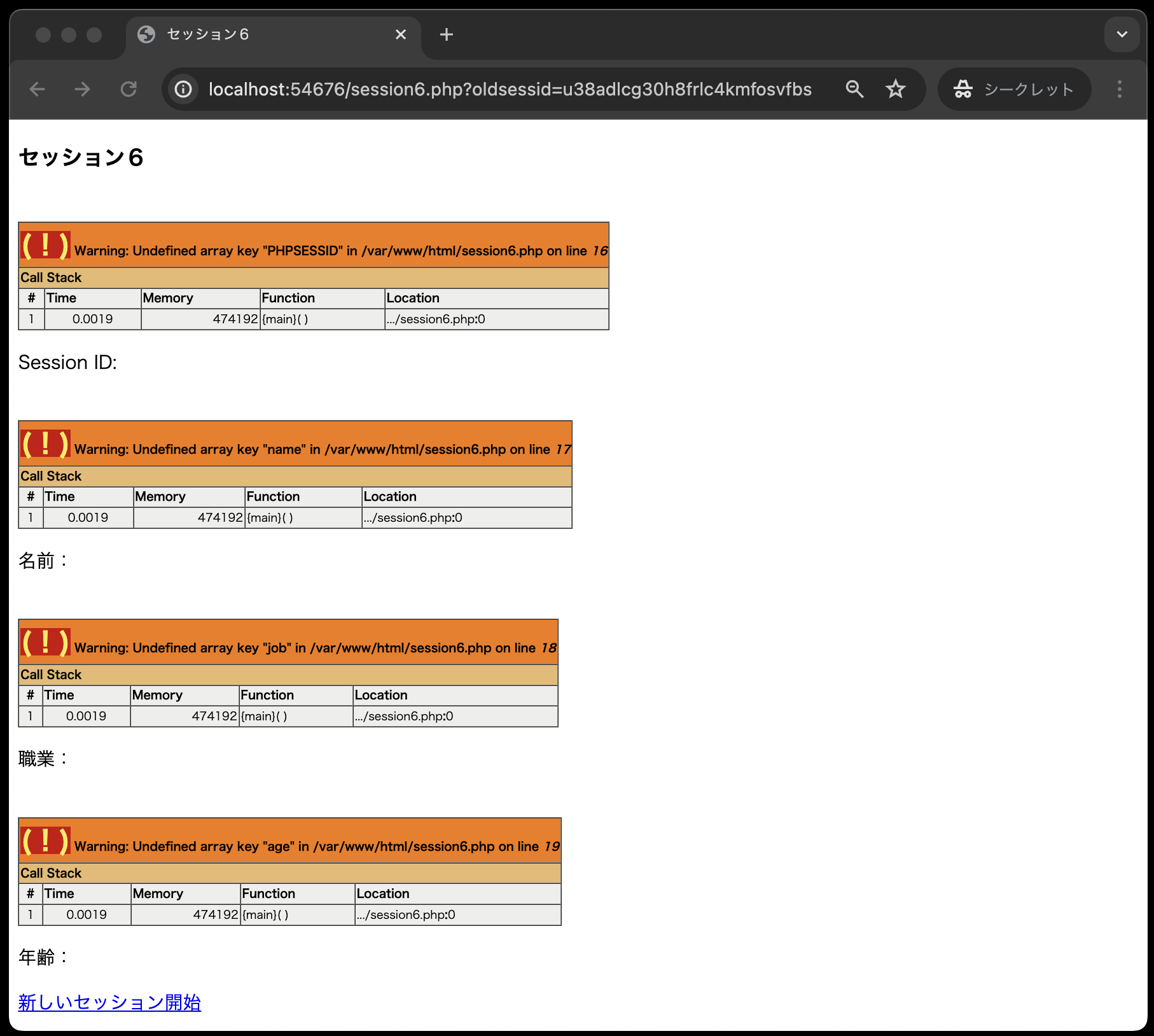 全てのデータがセッションから削除されているため、エラーメッセージが表示される。 また、セッションIDも削除されたため、ここで新しいセッションを開始します。